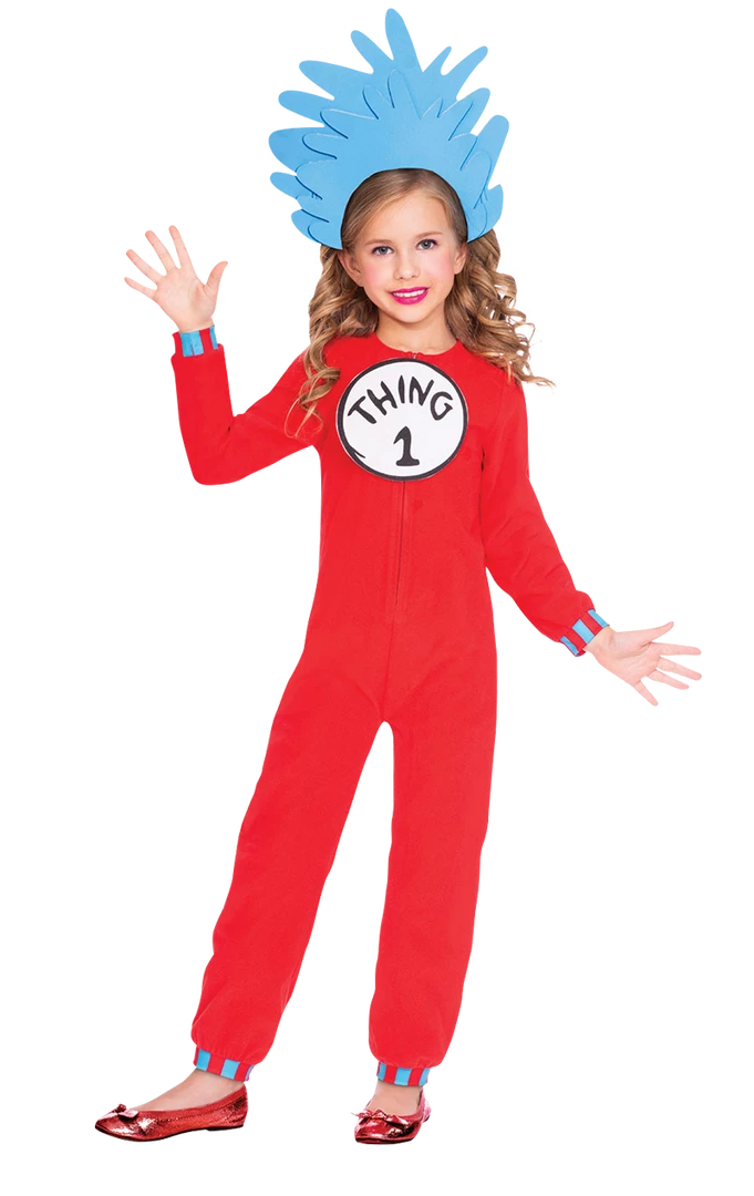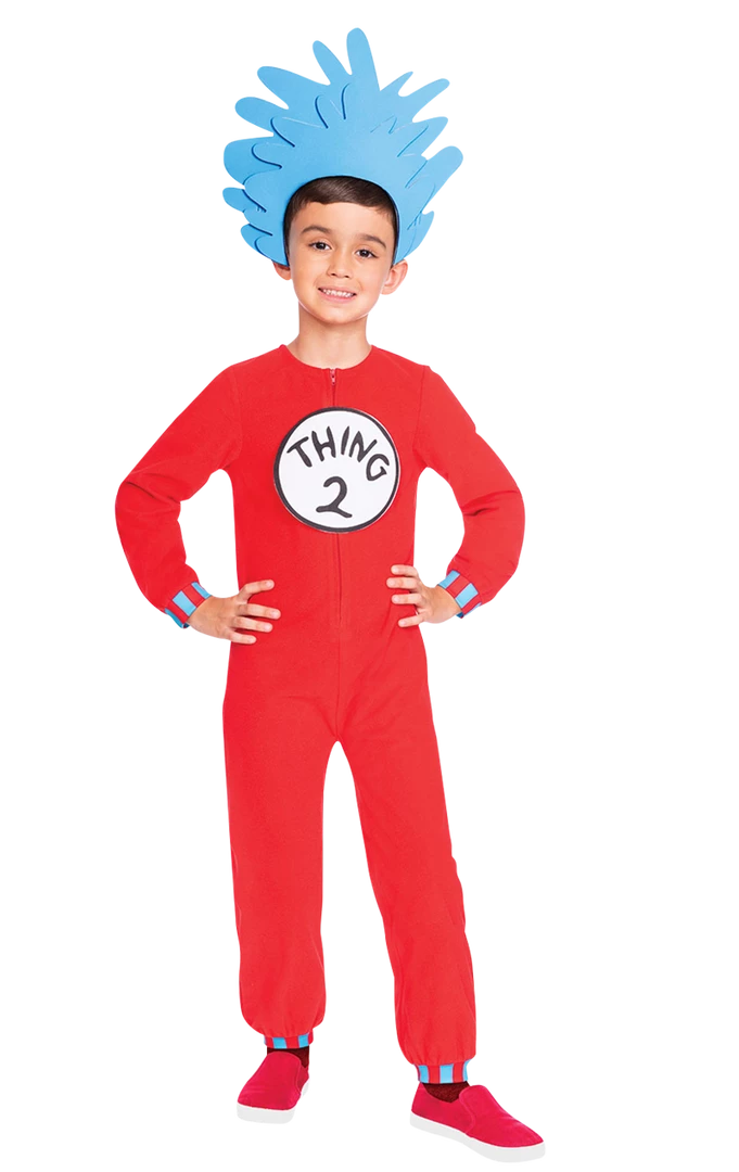 The Thing One & Thing Two Costume is made up of one red jumpsuit that contains ‘Thing 1’ and ‘Thing 2’ interchangeable chest badges on the front. Completing the look is a blue foam headpiece, which represents the crazy hair style of the characters.