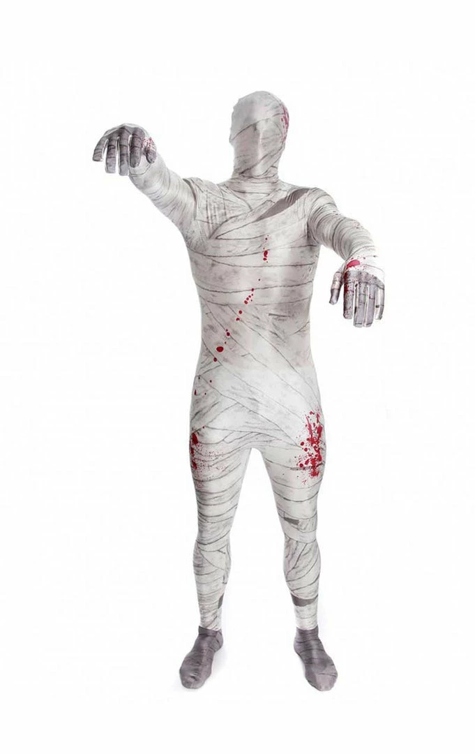 Choose an individual look this Halloween with the Adult Mummy Morphsuit! The morphsuit is a one-piece lycra suit with a hood and mummy print.