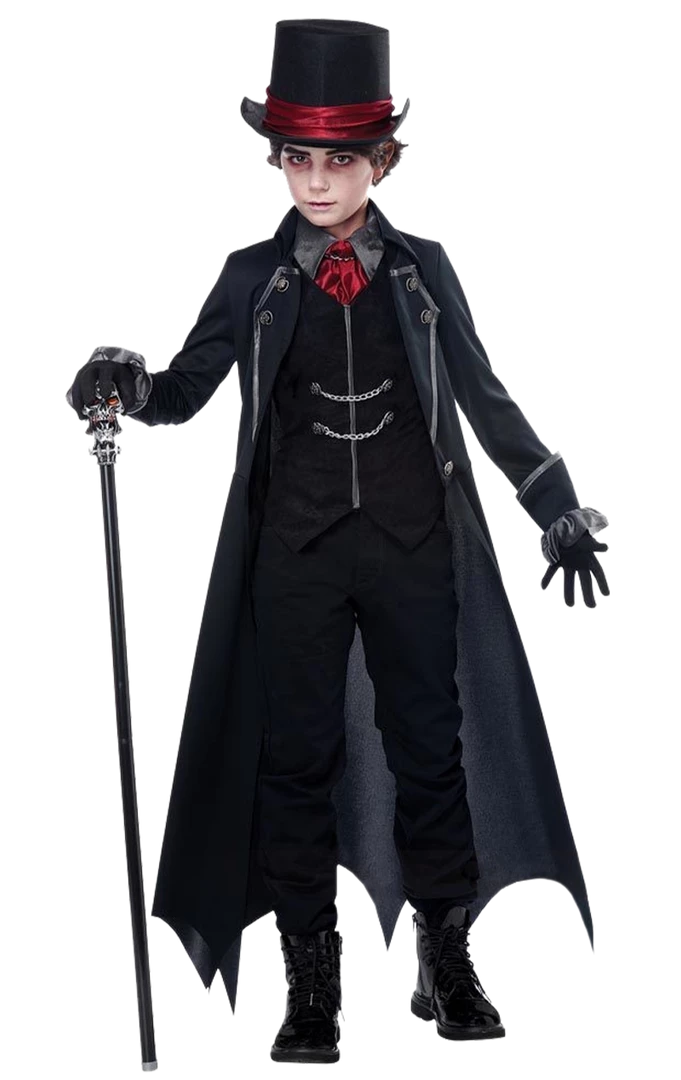 Inspired by classic gothic vampire tales, this Kids Vintage Vampire Costume will have your little vamp looking creepy yet stylish and smart. It comes with a long black jacket, black vest, dickie with attached cravat and three-piece hat with a striking red ribbon hatband.