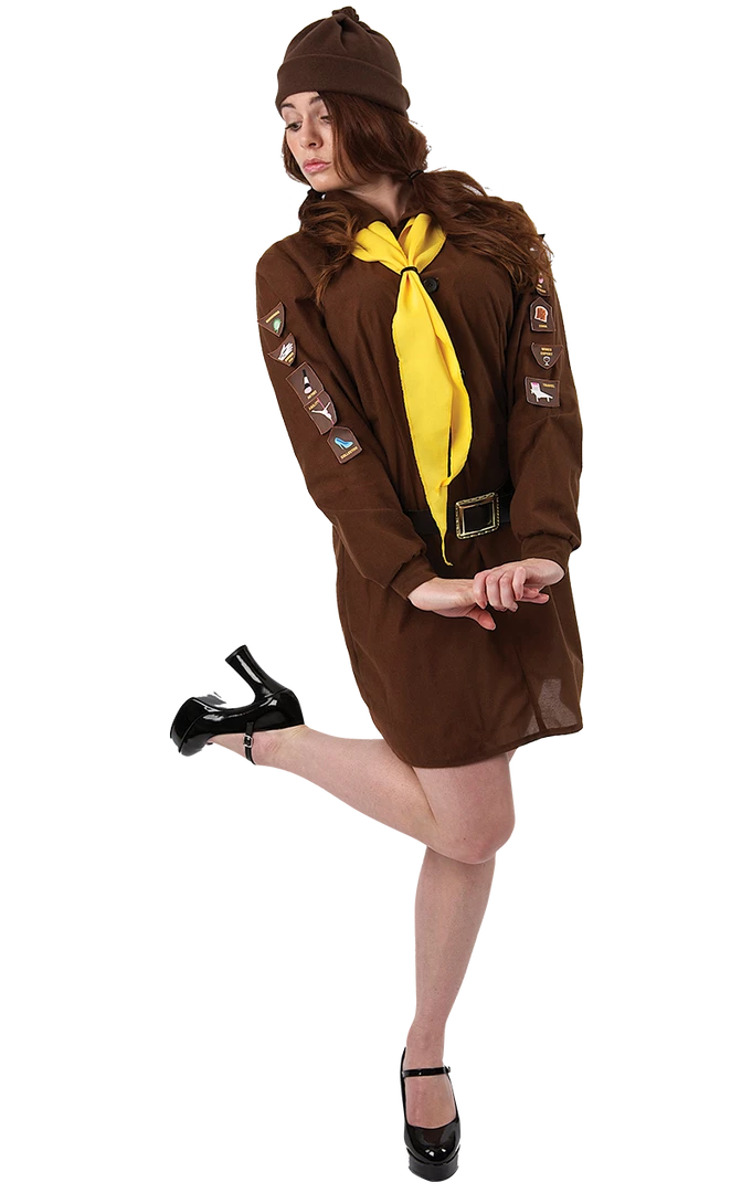 Have adventures and stories to tell in the Adult Girl’s Brownie Uniform Costume! The costume includes a brown dress and yellow neck tie, belt and hat.
