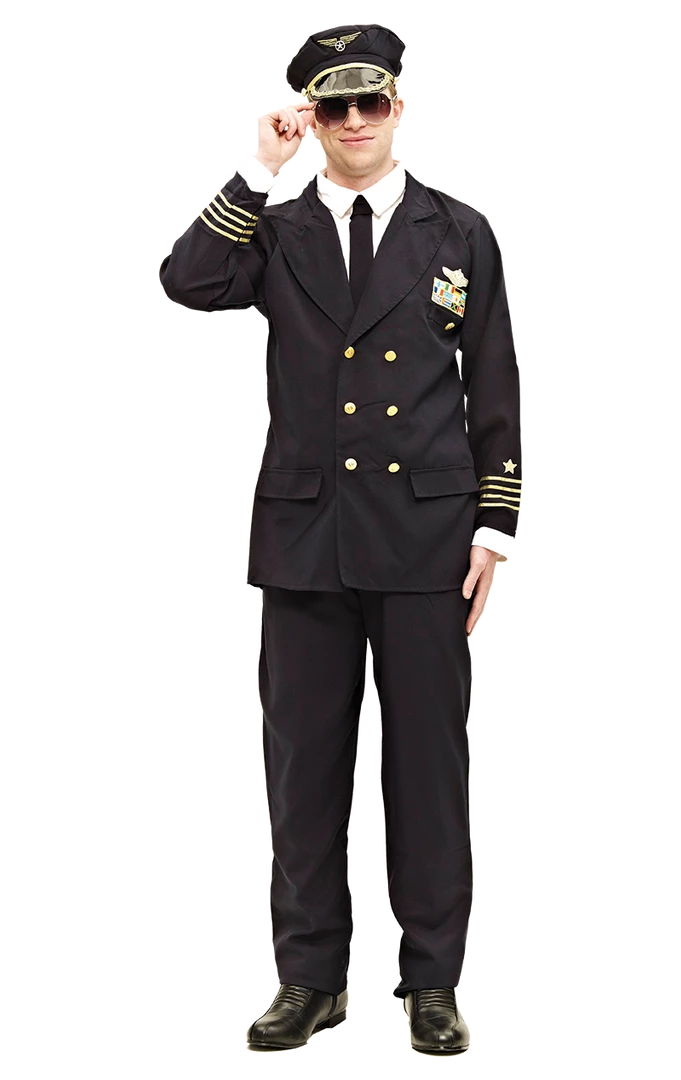 Our Adult Pilot Uniform Costume comes complete with a long sleeve black jacket with gold detailing throughout. There’s also a mock white shirt and black-tie underneath to ensure you’re looking the part. Team it up with a pair of plain black trousers, and of course, your black and gold pilot’s hat.