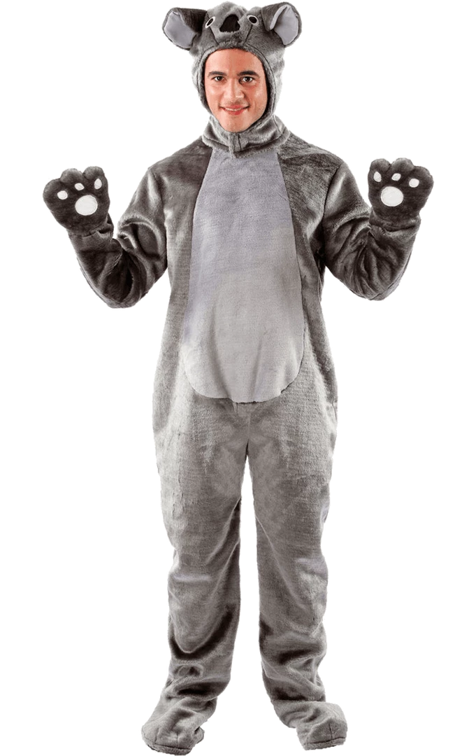 Eat eucalyptus in the Adult Koala Costume! This costume includes a grey jumpsuit with attached gloves and shoe covers and headpiece.