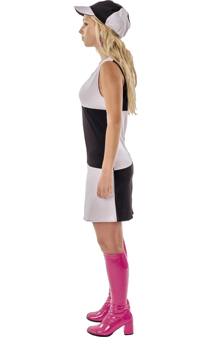 Look like a 1960s model in the Adult 60s Black & White Chequered Dress! This costume includes a checked dress and a hat.
