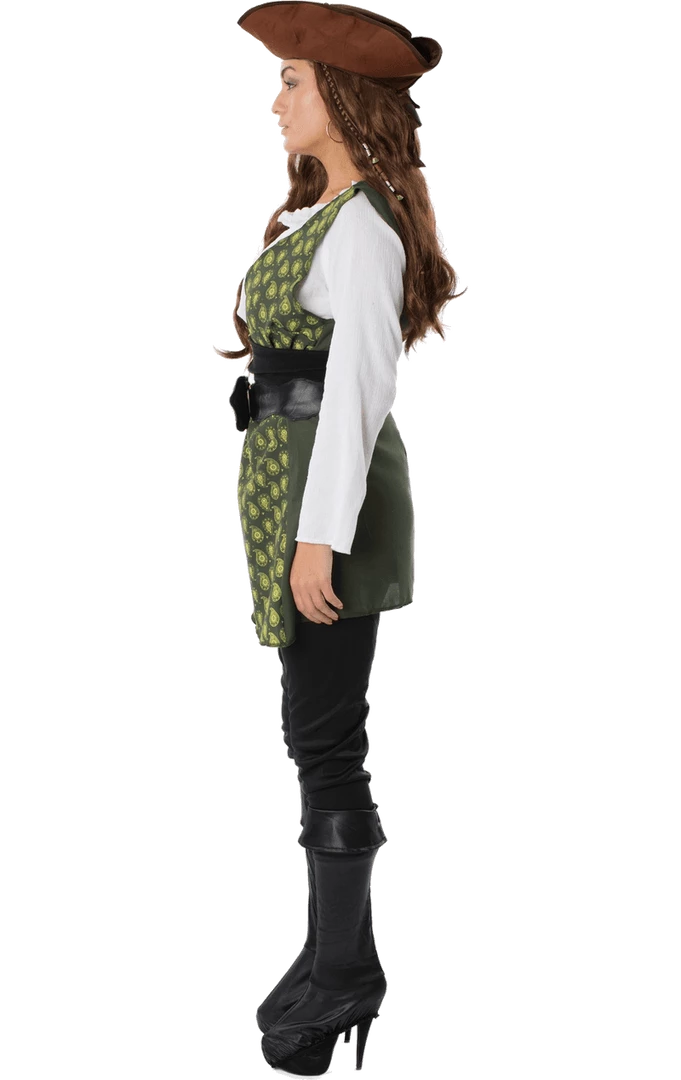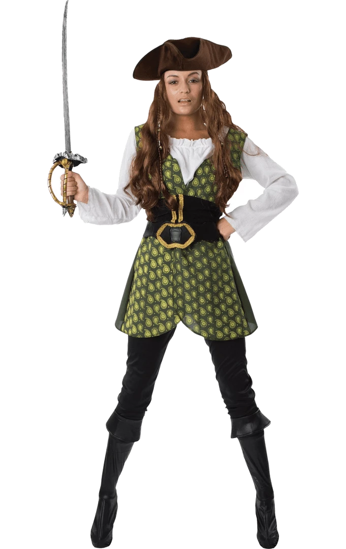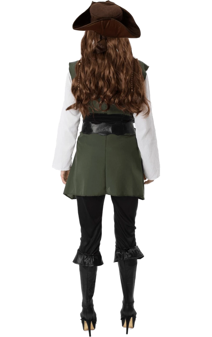 Spy land in the Adult Matey Pirate Costume! The costume includes top, trousers, waistcoat, waspie, belt, boot toppers, and hat.