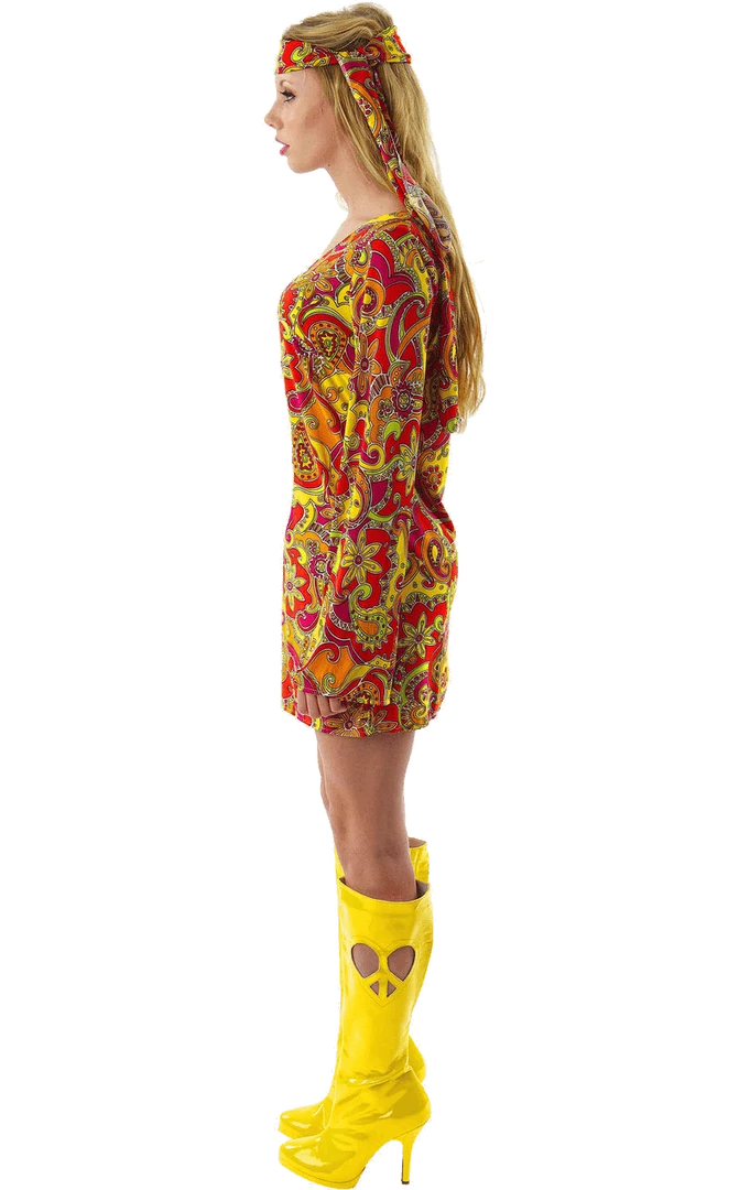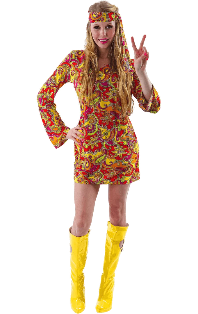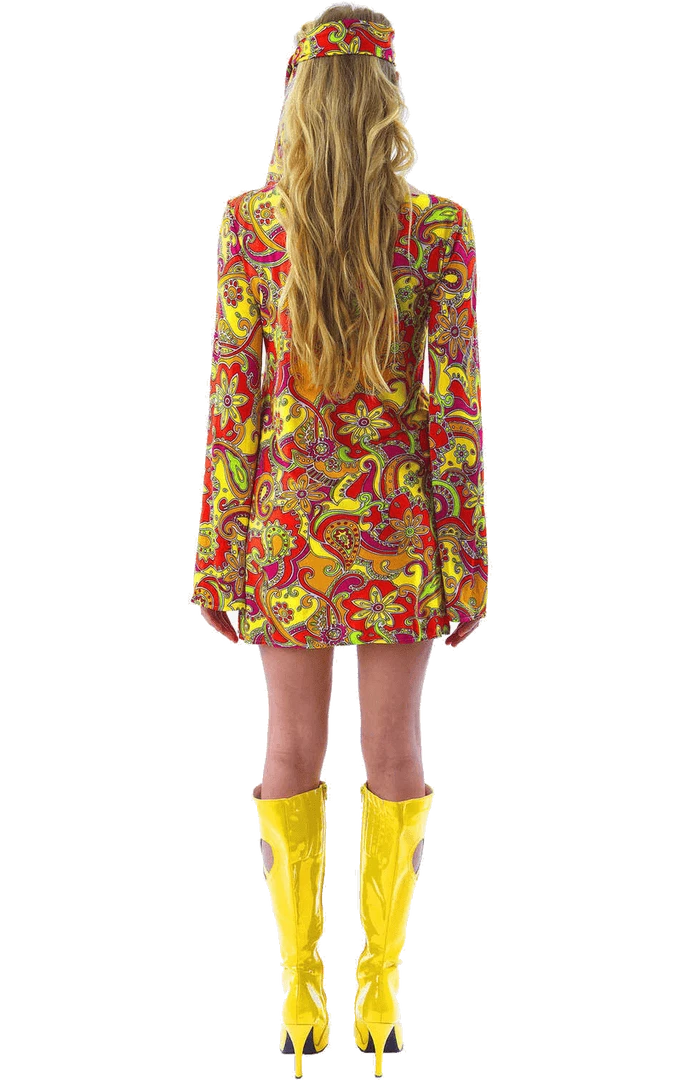 Feel the flower power in the Adult Female Hippie Costume! The costume includes a multicoloured paisley design dress with matching head tie.