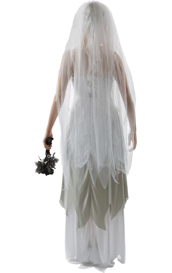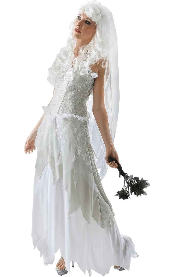 Say I do with the Adult Ghostly Bride Halloween Costume! The costume includes a white and grey dress with tatty hem and veil.