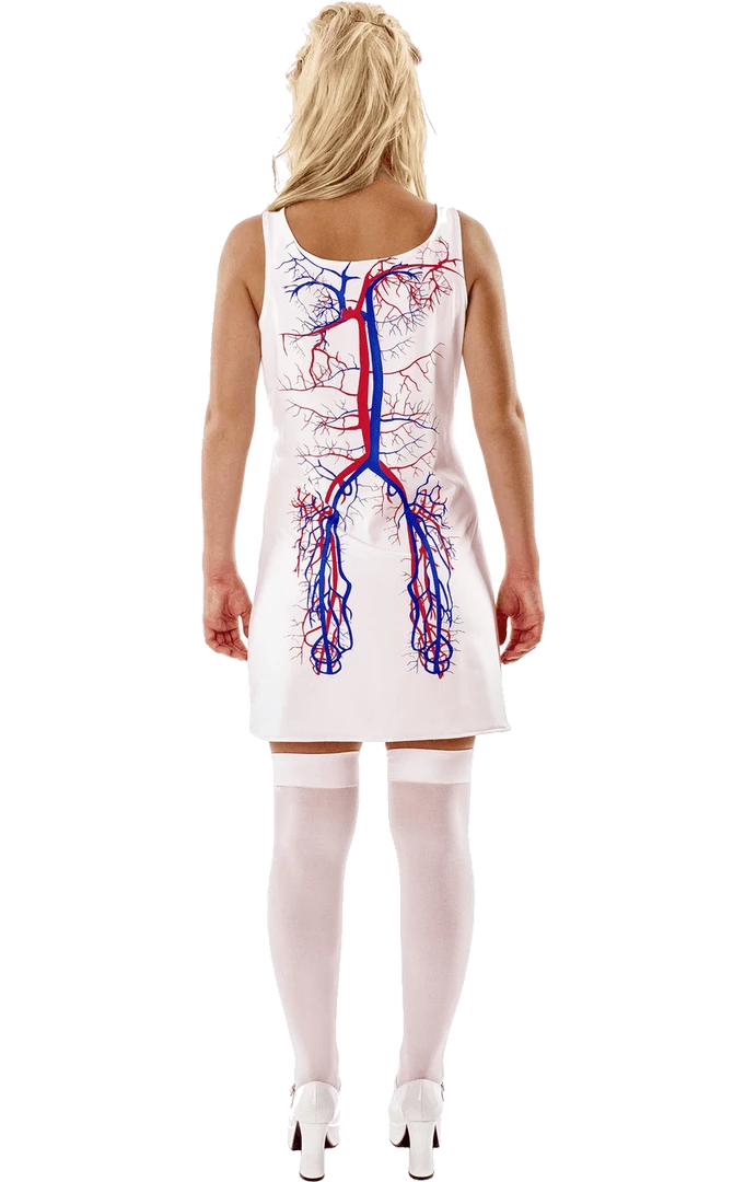 Get medical in the Adult Artery Dress! This dress is short and white with a blue and red vein and artery pattern.