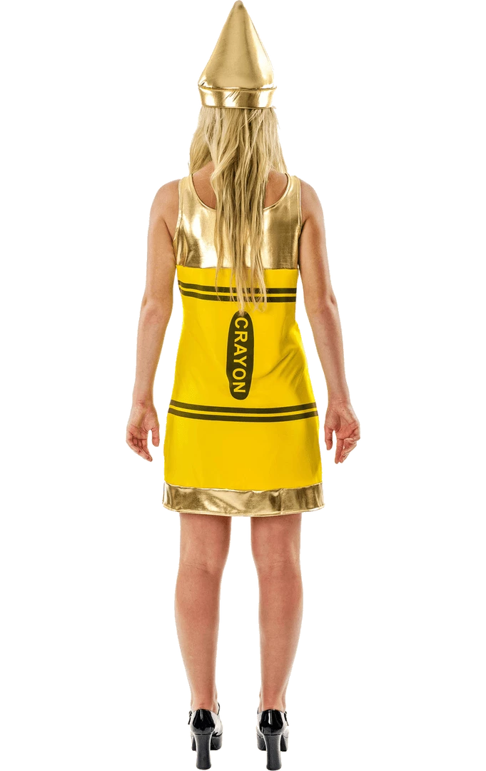 Stand out in the Women’s Yellow Crayon Costume! This costume includes a short yellow with gold piping dress and hat.