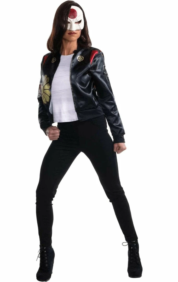 Her costume comes in two parts: a jacket with attached shirt and a mask. In the Suicide Squad she was wearing her typical bomber jacket in black with a gold flower print and red accents. The white mock-shirt is attached to the jacket.