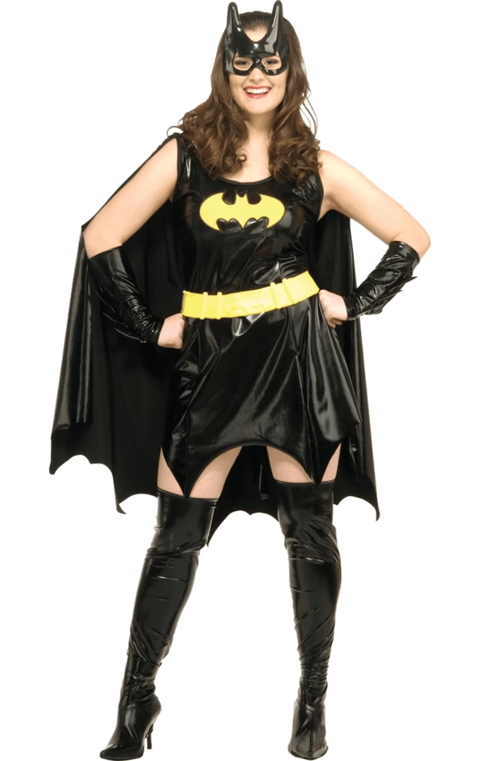 Be sexy and strong in the licensed Plus Size Batgirl Sexy Superhero Costume! The costume includes a PVC dress with Batgirl logo, cape, belt, glovelets, boot tops and eye mask.