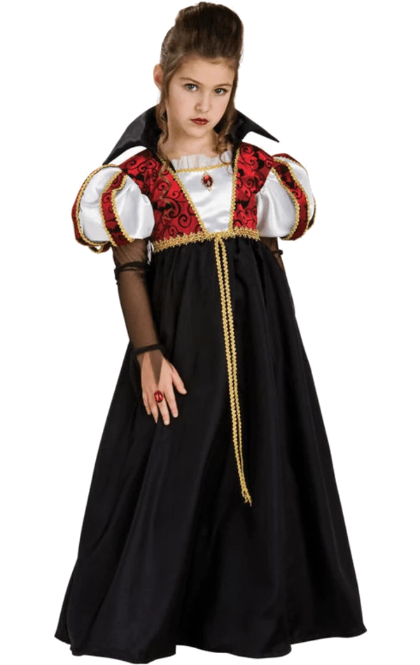 This elegant girl’s vampire costume includes a dress with long black skirt and gold braiding, making her look like the queen of all vampires.