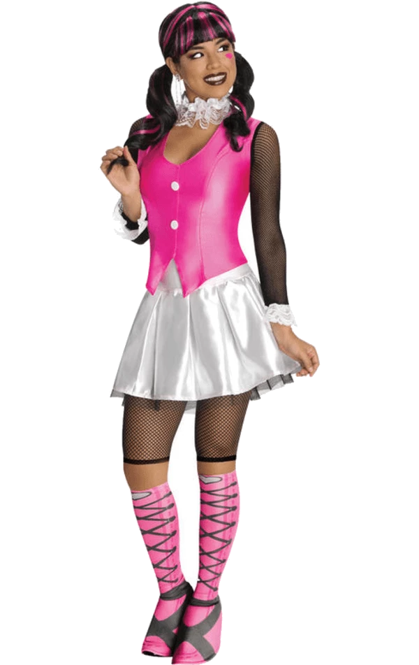 The Monster High Draculaura Costume consists of a short white satin skirt, topped with a shirt that has black meshed sleeves, and an attached hot pink waistcoat.