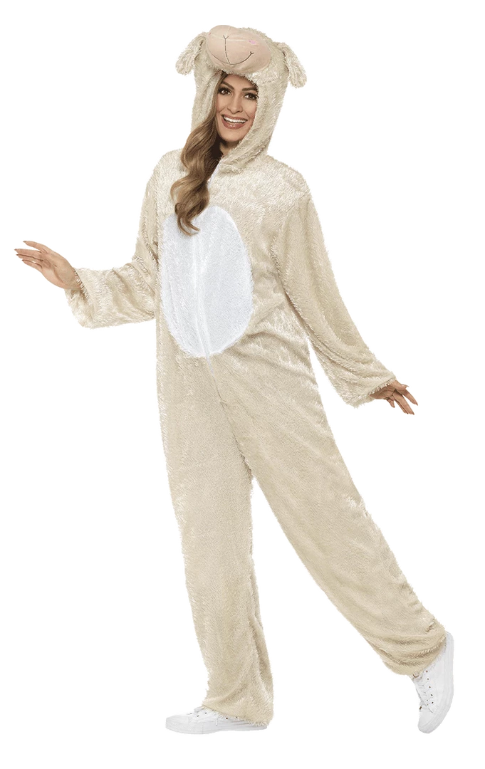 The Adult Lamb Costume includes a soft cream jumpsuit with a hood and red bell around the neck.