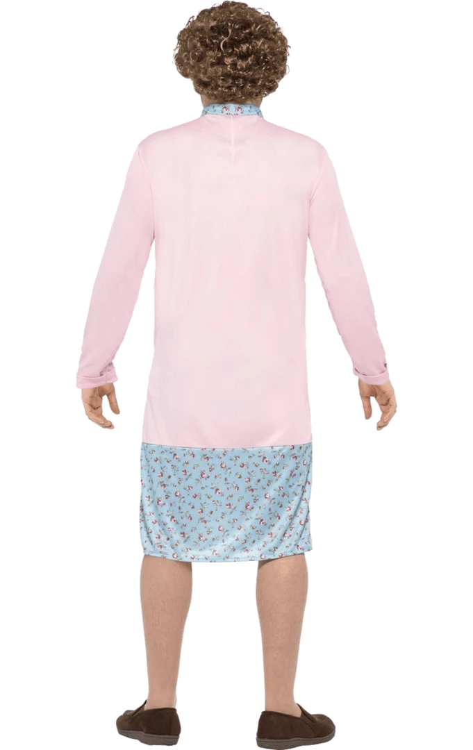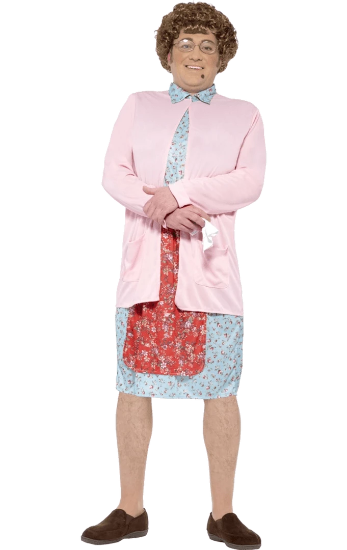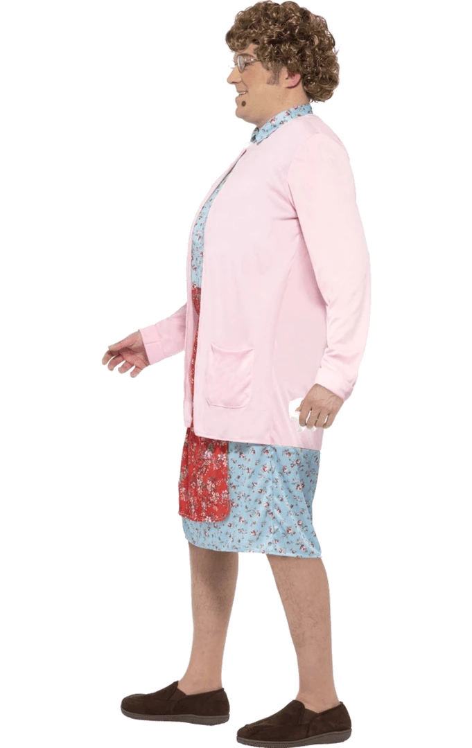 Make the party laugh with the Adult Mrs Brown Costume! This costume includes a padded blue floral dress & pink cardigan, wig, glasses, handkerchief and mole.