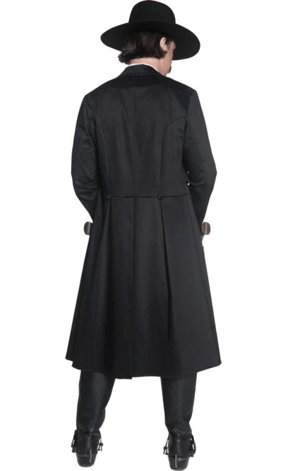 This Western Sheriff costume includes a black top with gold button detailing and a long black jacket.