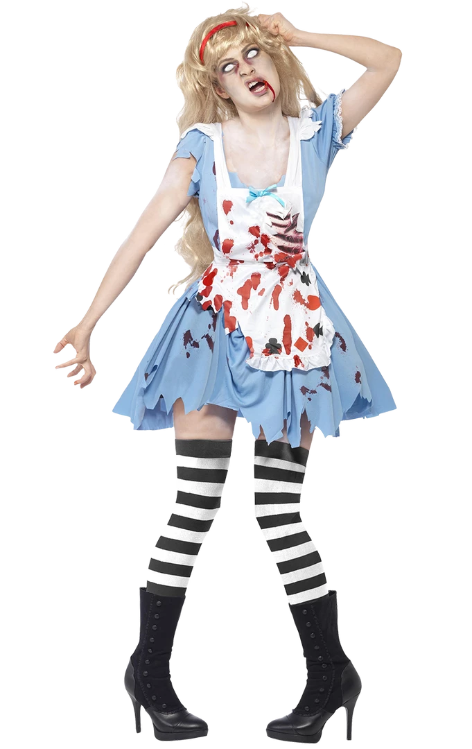 Fall into the Halloween party with the Adult Zombie Alice in Wonderland Costume! This costume includes a dress with latex chest, apron and headband.