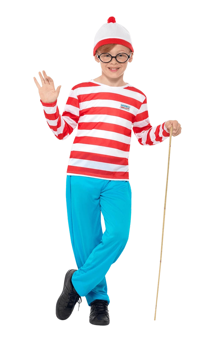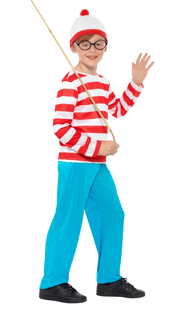 Try to be found in the licensed Child Where’s Wally Costume! This costume includes blue trousers, stripy long sleeved top, matching bobble hat and black glasses.