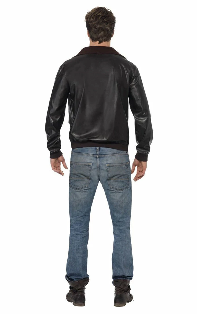 The 80’s Top Gun jacket is a deep shade of brown faux leather with a soft fleece collar. It has a zip-up front and badges on the chest and left arm, which includes the American flag and the Top Gun logo.