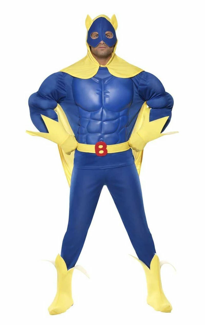 Feel the power of fruit with the licensed Adult Deluxe Bananaman Costume! This costume includes a blue and yellow jumpsuit with EVA muscle detail, cape and headpiece.