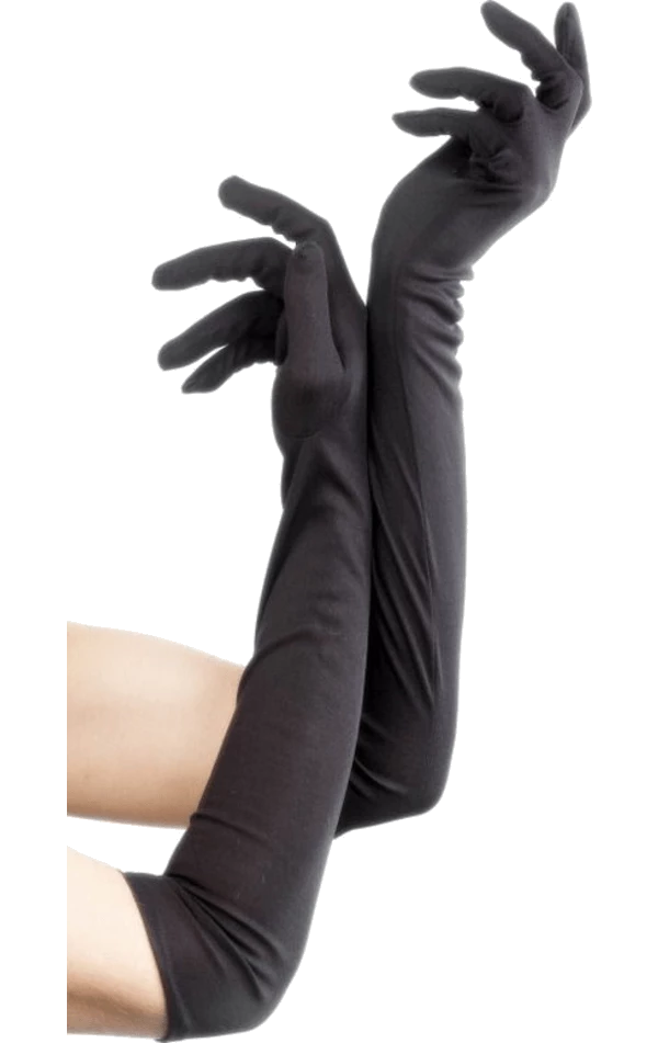 One pair of long black jersey fabric gloves, measuring 50cm in length.