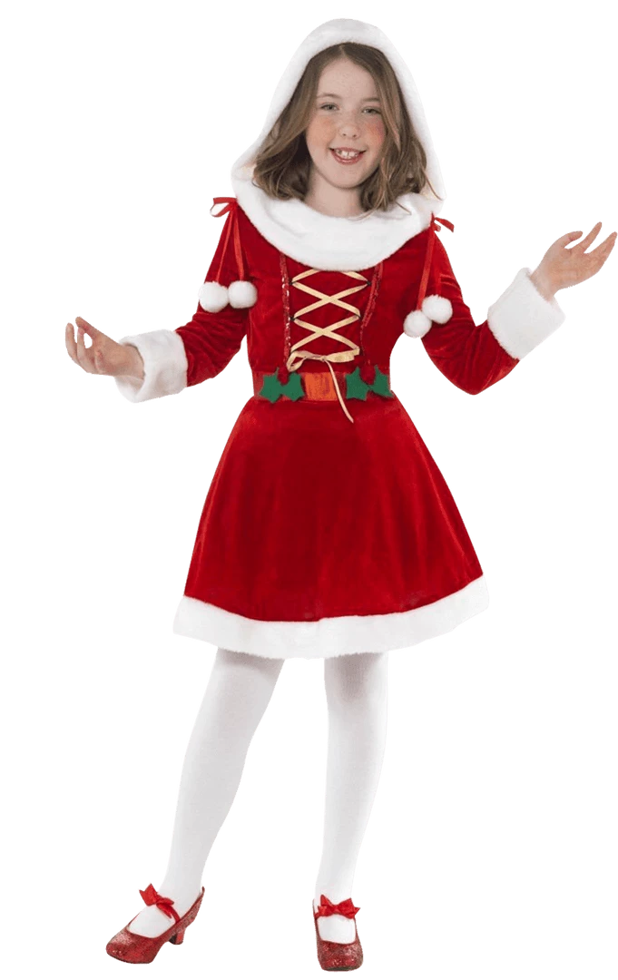 She will look festive this year in the Child Little Miss Santa Costume! The costume includes a red and white hooded dress with lace up front detail.