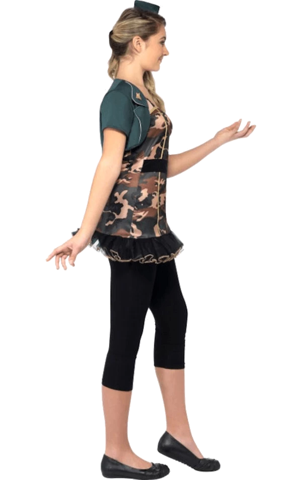 Stand to attention with the Teen Miss Army Girl Costume! The costume includes a short camouflage dress, cropped dark green jacket and matching mini hat.