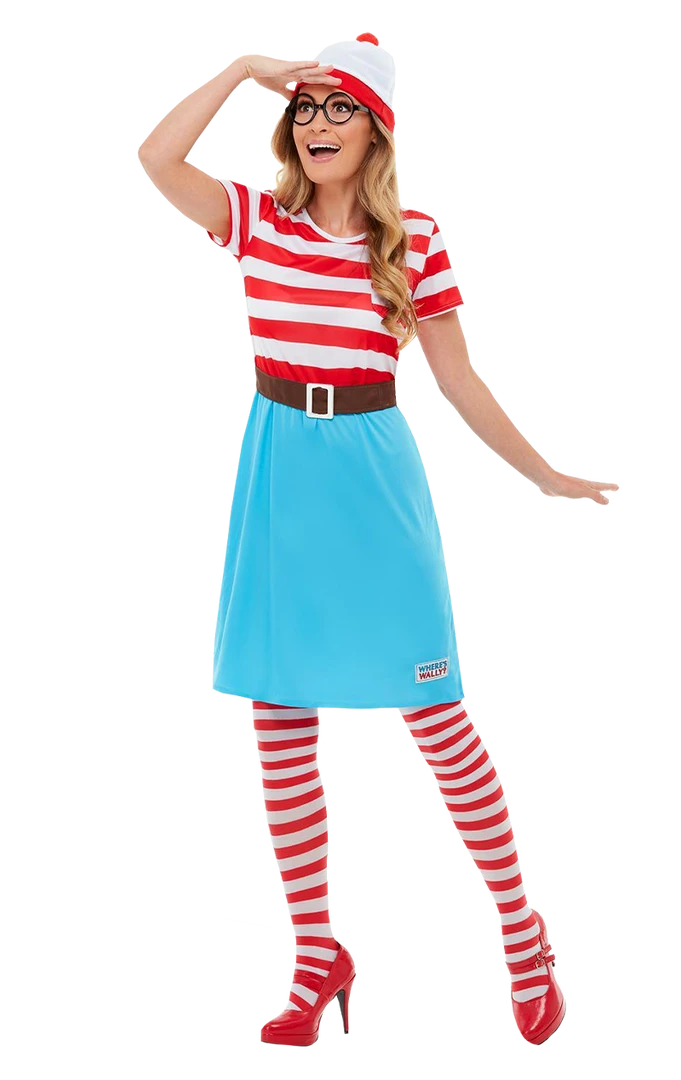 The Where’s Wally Wenda Costume also includes her black iconic glasses, belt and a Where’s Wally logo imprinted on the bottom left of the skirt.