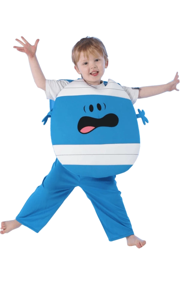 Be very careful in the licensed Child Mr Bump Dress Up Costume! The costume includes blue trousers and a blue and white Mr Bump tabbard.